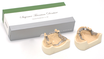須山歯研では、チタンの生体親和性はそのままに、コバルトクロムをも凌ぐ強靭な物性を持つGC社チタンニオブ合金(T−アロイ・タフ)を採用。 溶解時の酸化が激しく、湯流れの悪いチタンニオブ合金鋳造のため、埋没材を含め独自開発の鋳造システムを構築。生体親和性はもちろん適合、強度、機能、審美性すべてを併せ持つ、究極のチタン床が完成しました。